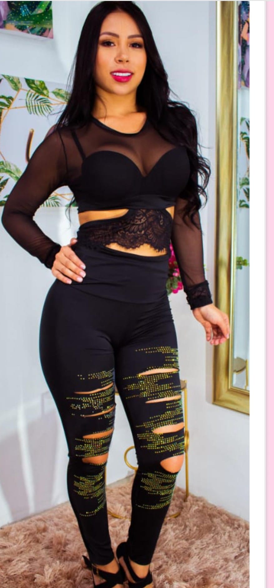 Conjunto de brillos de licra y blusa. Licra con brillos 4 averturas en las piernas cintura alta, blusa con transparencia y encaje en la cintura.