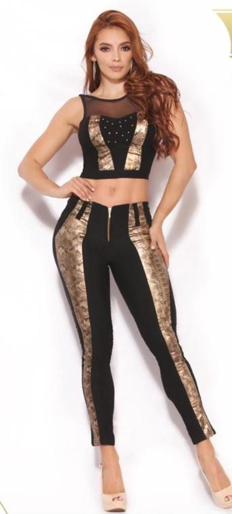 Conjunto negro elastico, top con transparencia y predreria en el pecho estampado print y cremallera atras, pantalón elastico con realce de gluteos, talle alto y cremallera en el frente.