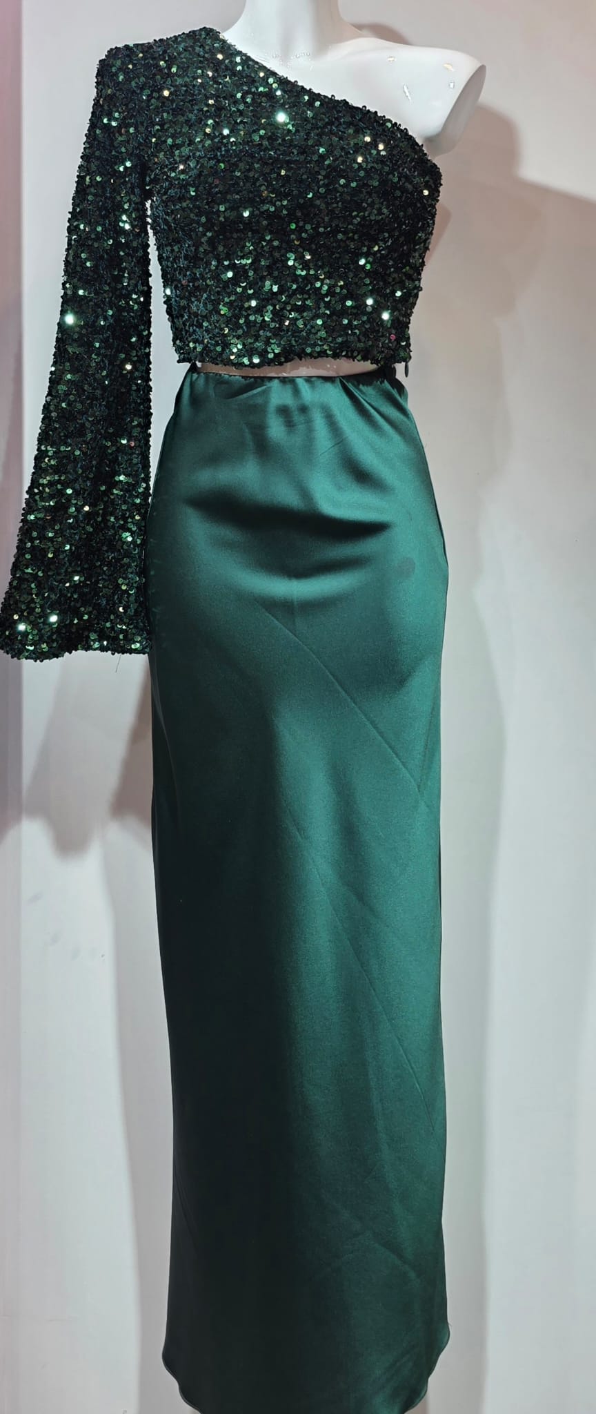 Conjunto de falda y blusa verde esmeralda, falda en saten con elastico en la cintura, blusa en lentejuelas de una manga y cremallera en el lateral.