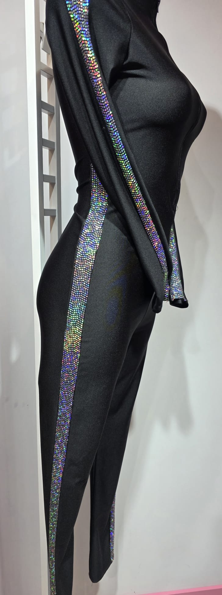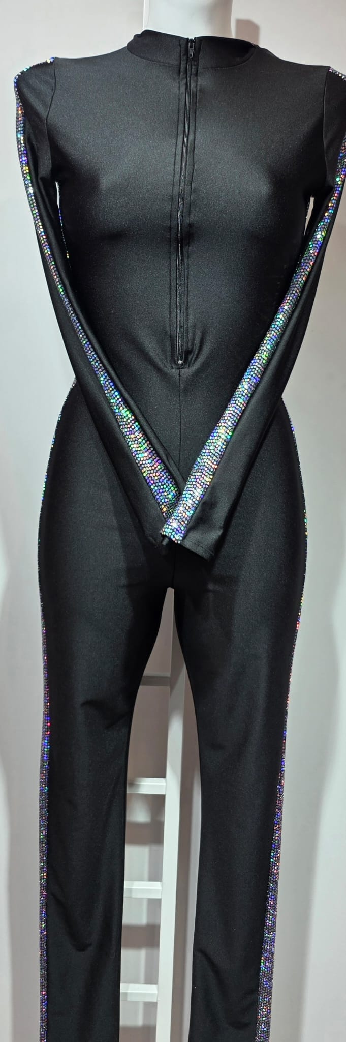 Mono negro licrado con aplique brillantes en las mangas y costados, cremallera delantera.