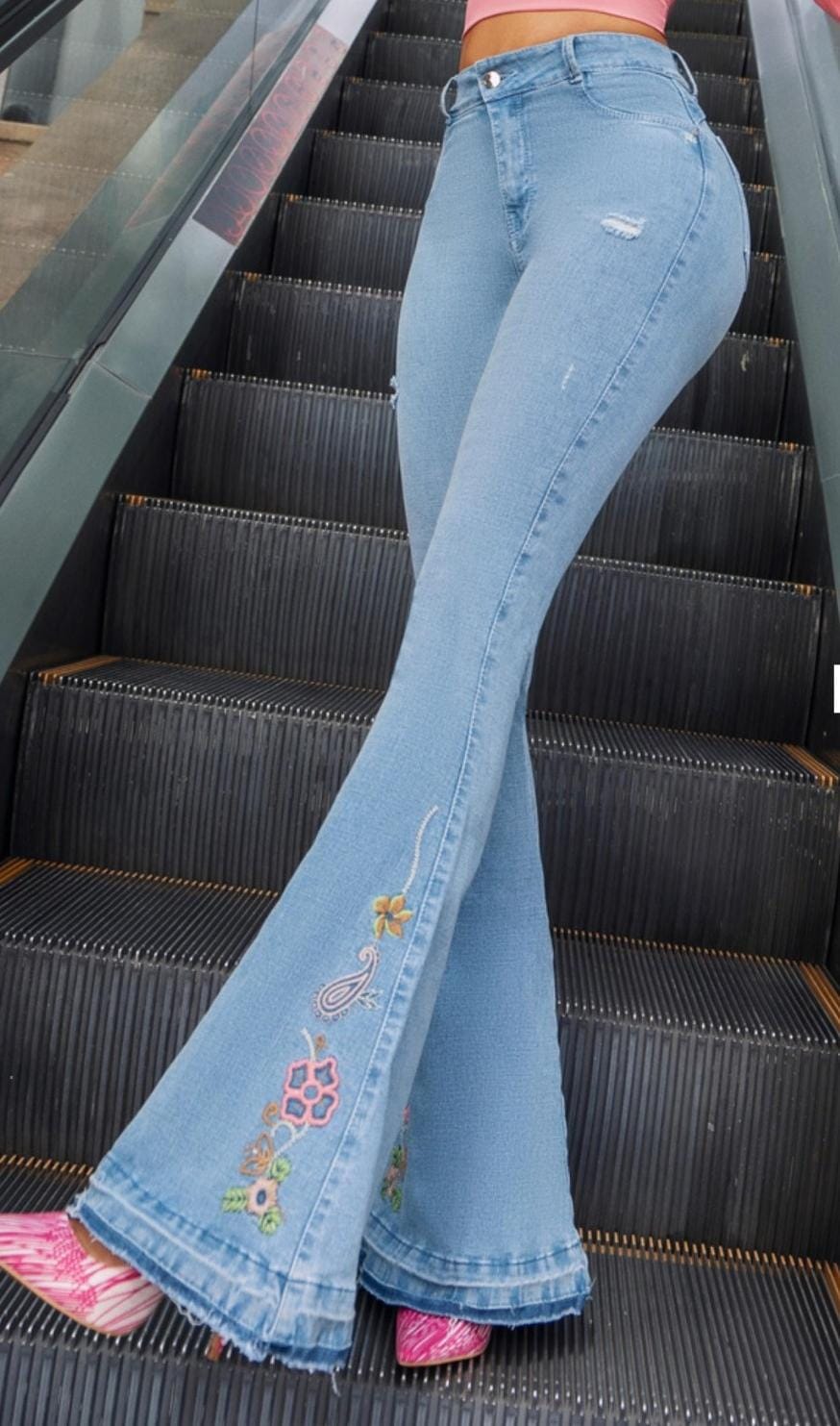 Vaquero azul claro, bota campana, aplique de flores en el bajo, talle alto, realce de gluteos, bolsillos atras.