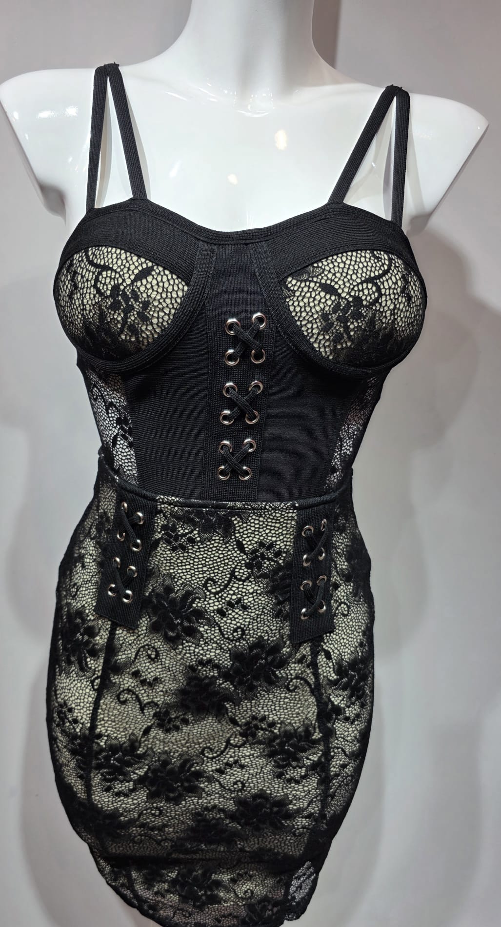 Vestido faja corto con encaje de flores, tirantes y cremallera invisible.