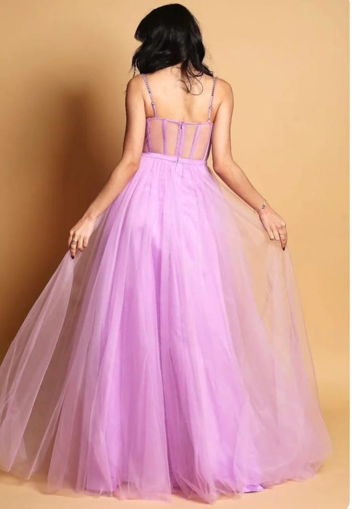 Vestido eventos color lila, estilo corset con pedreria en el pecho, tres capas con forro interno y cremallera invisible