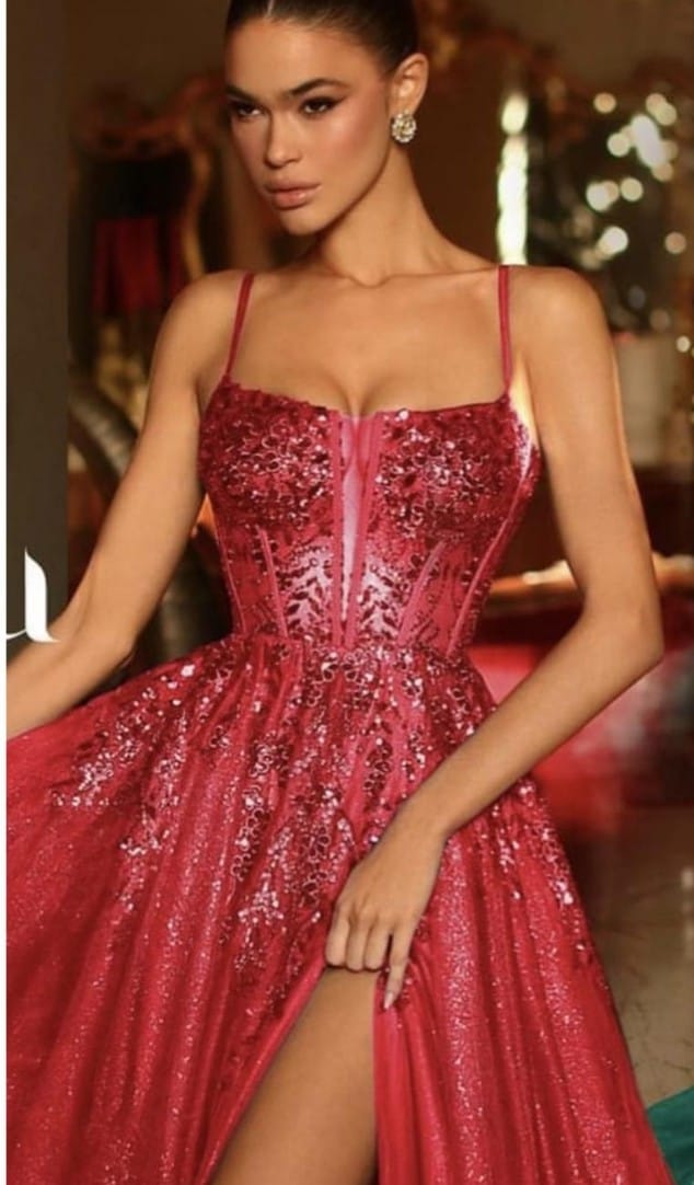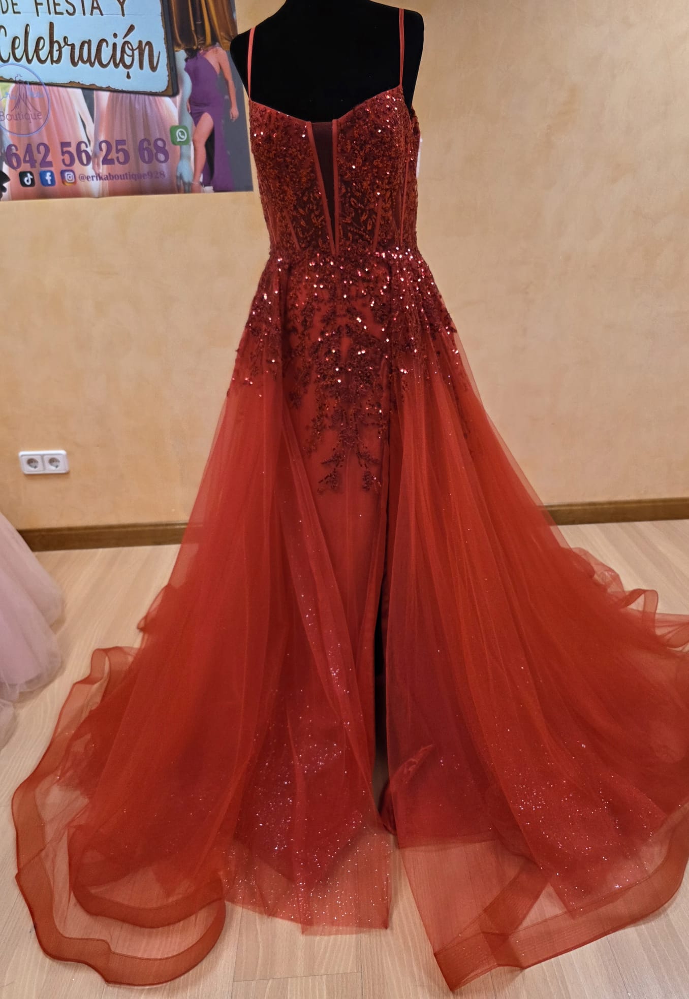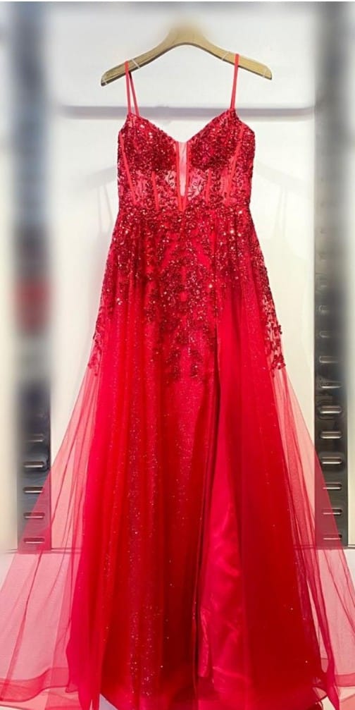 Vestido Eventos rojo con pedreria y brillos en el pecho, escote en V, tres capas y cremallera invisible en la parte de atras