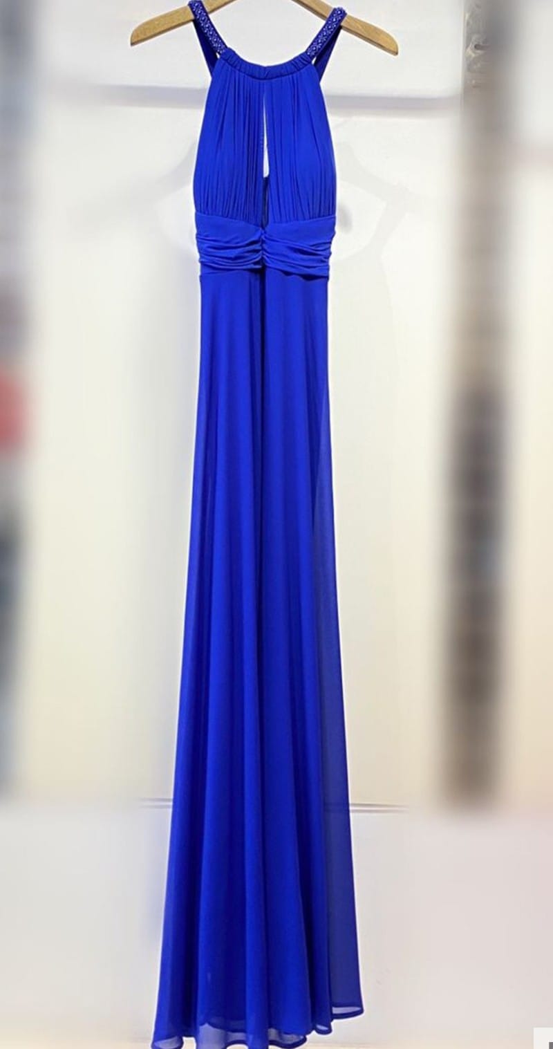 Vestido azul con pedreria en el hombro, escote en el pecho, recogido en pecho y cintura, avertura en pierna izquierda y cremallera invisible en la parte de atras.