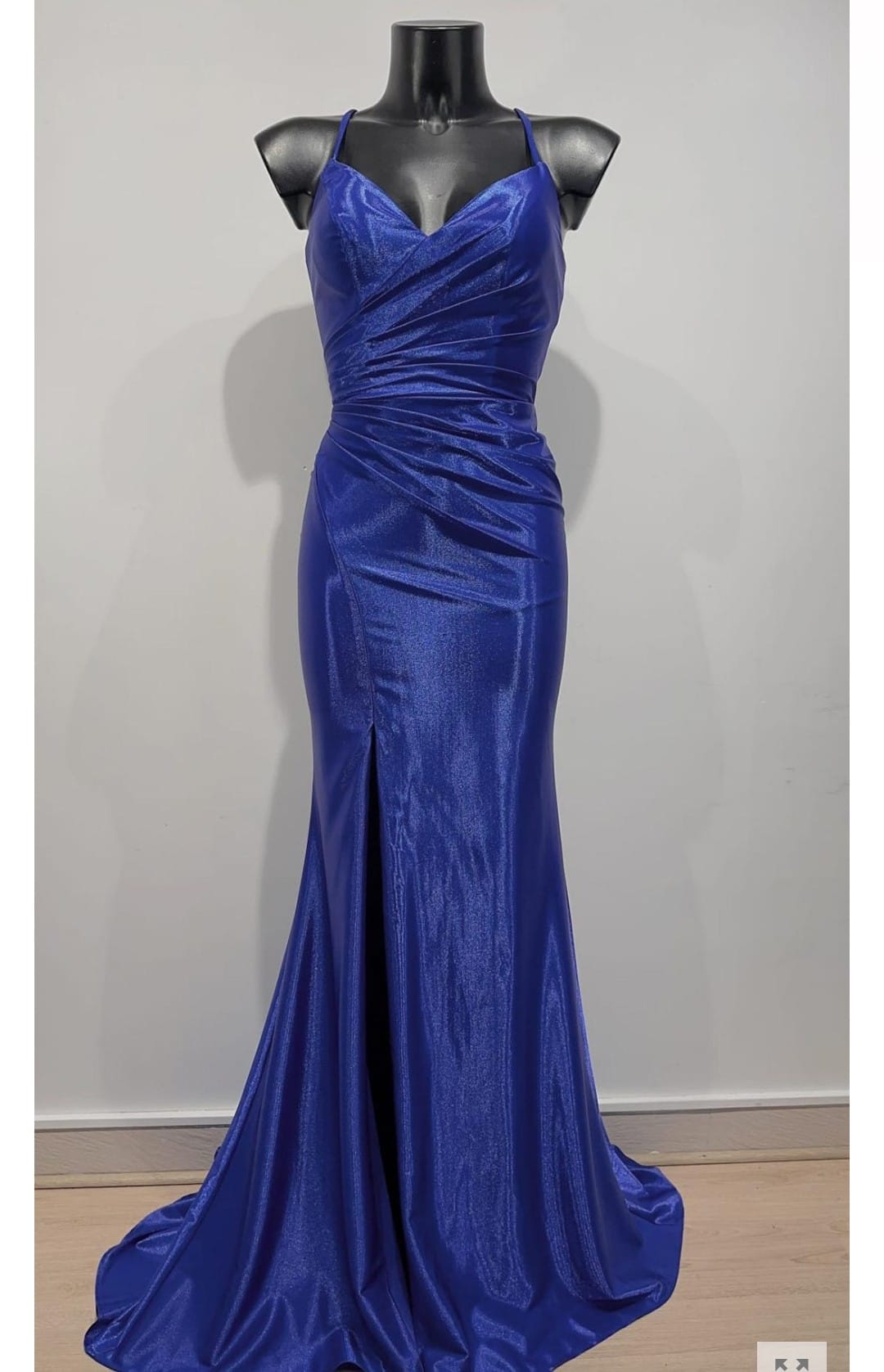 Vestido en saten azul con tirantes y escote V, estilo corset que ajusta pecho y espalda, pliegues en el cintura, avertura pierna izquierda y cremallera invisible.