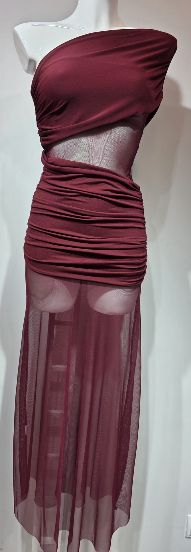 Vestido burdeos con transparencia en cintura y piernas, licra en pecho y caderas.