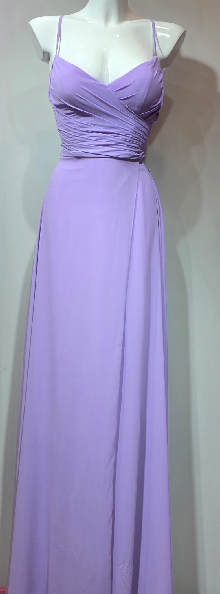 Vestido lila de escote corazon de atar en la espalda, pliegues en el pecho, avertura pierna izquierda y cremallera invisible