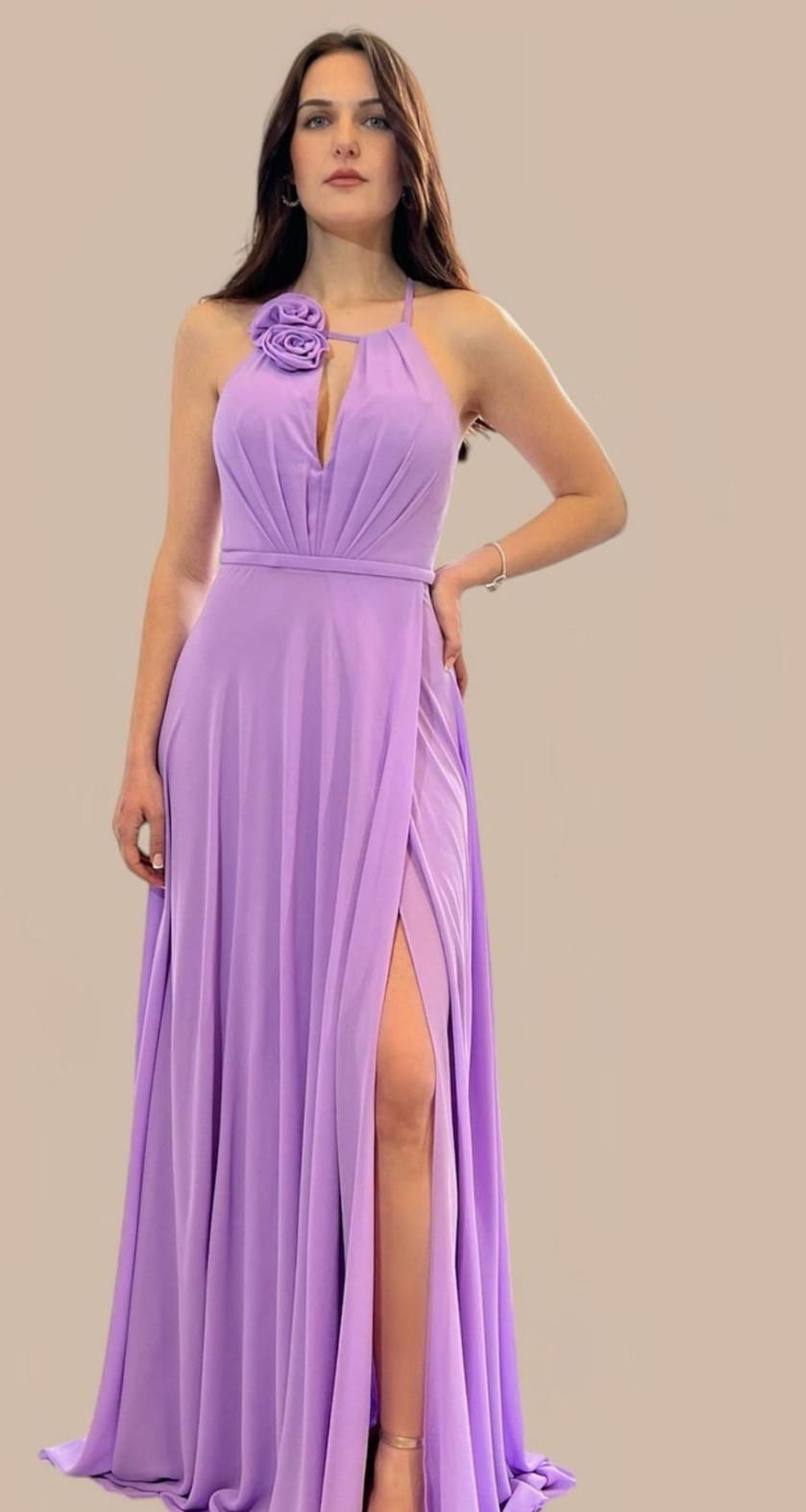 Vestido lila con escote y aplique de flores en el pecho, tirantes y lazo en la parte de atras, pliegues en la cintura, avertura pierna izquierda y cremallera invisible.