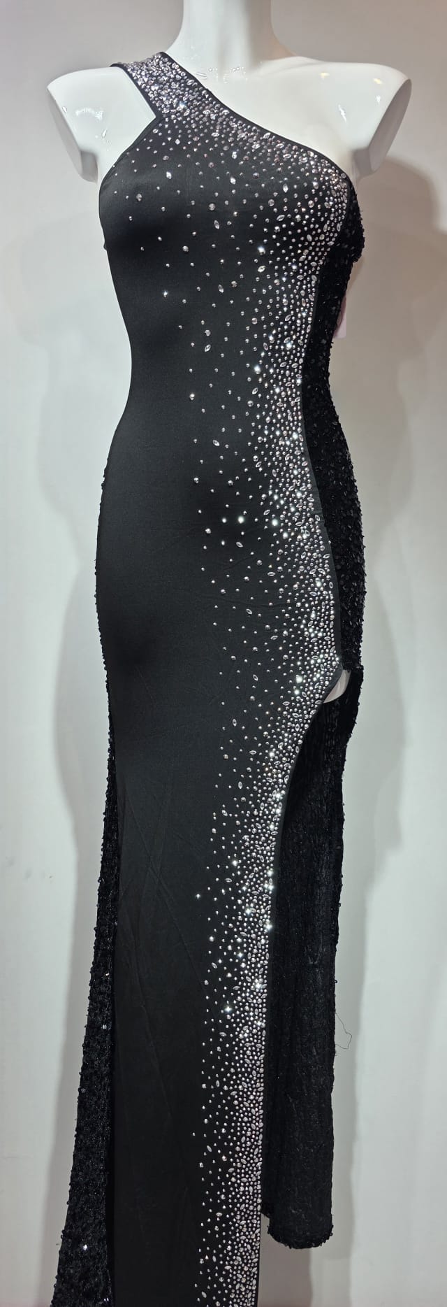 Vestido negro con predreria y lentejuelas plateadas, de un solo hombro, avertura pierna izquierda y cremallera invisible.