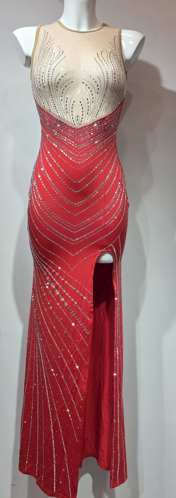Vestido rojo beige con pedreria plateada, sin mangas, avertura en pierna izquierda y cremallera invisible