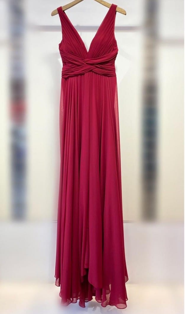 Vestido plisado rojo con recogido en pecho y cintura, cremallera invisible en la parte de atras.