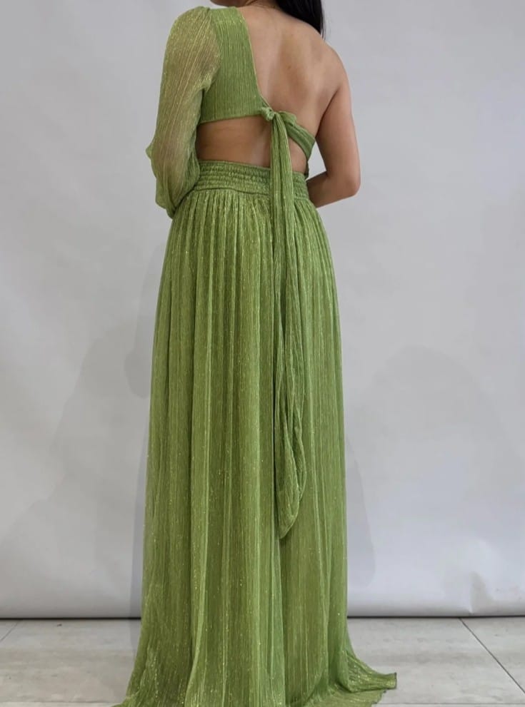 Vestido verde de una manga larga, lazo y alastico en la parte de atras que ajusta pecho y espalda, forro interno y avertura en pierna izquierda