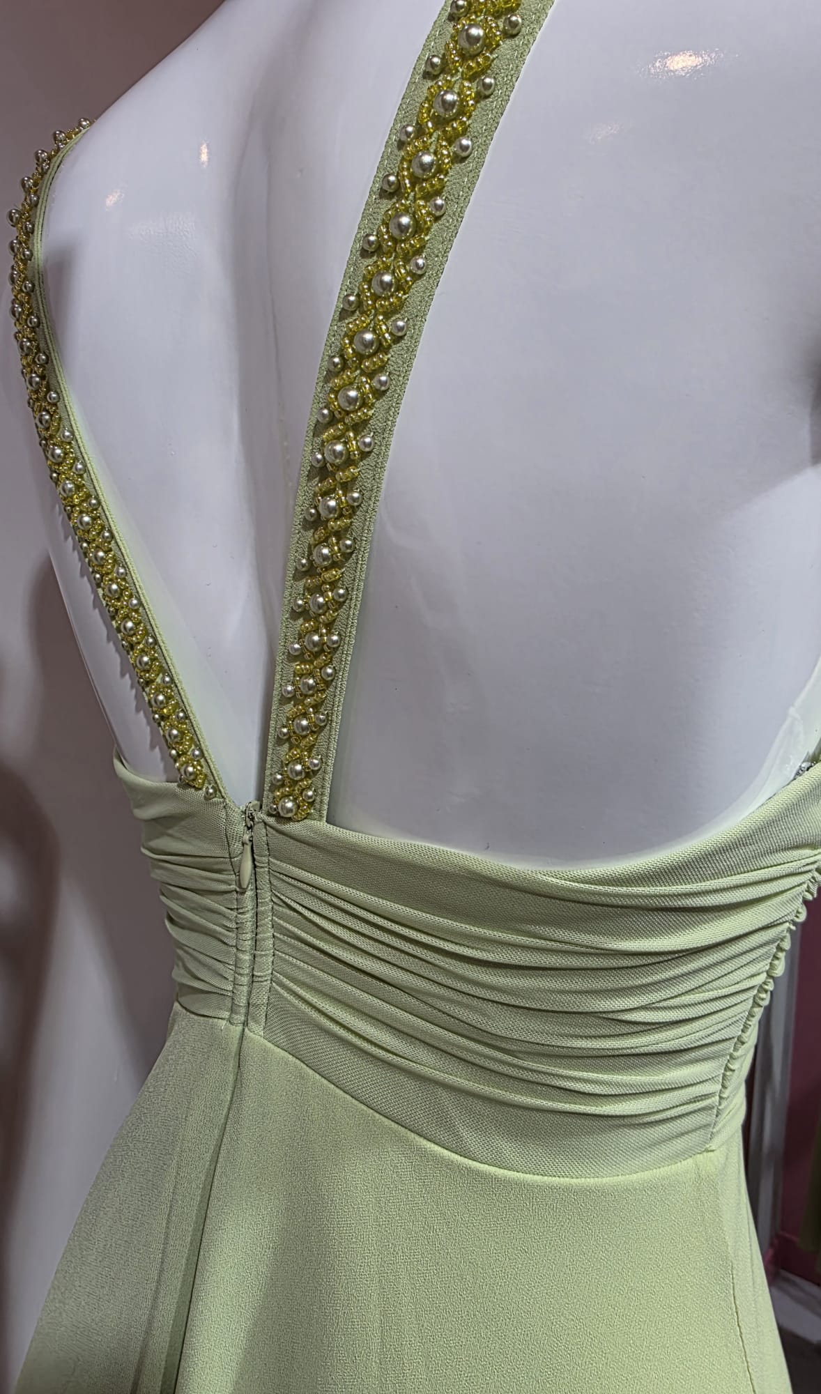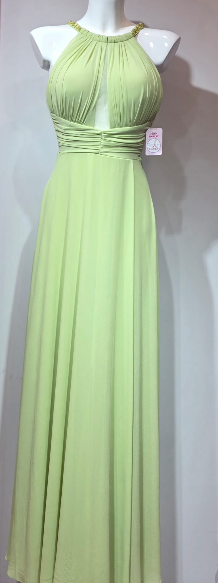 Vestido verde manzana con pedreria en los tirantes, escote y pliegues en el pecho y cintura, avertura pierna izquierda y cremallera invisible