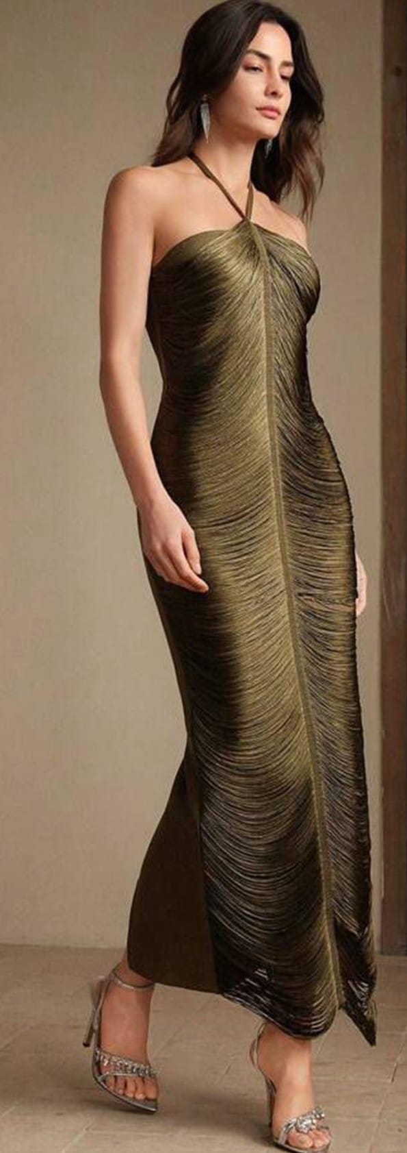 Vestido verde con tirante en el cuello, aplique de tirantes delanteros, avertura en la parte de atras y cremallera invisible