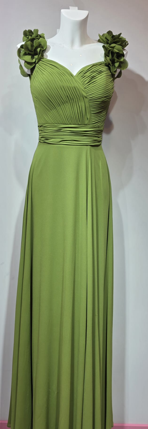 Vestido verde con pliegues en pecho y cintura, aplique de flores en el hombro, avertura pierna izquierda y cremallera invisible.