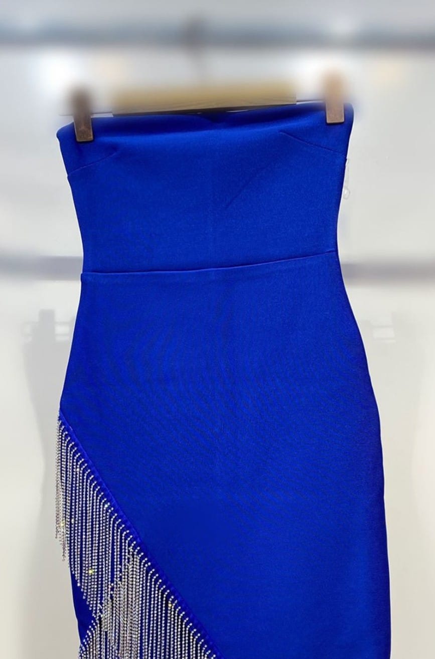 Vestido faja azul con pedreria en la parte inferior y cremallera invisible en la parte de atras.