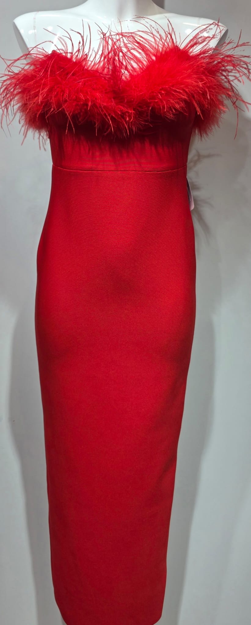 Vestido midi estilo faja color rojo, plumas en el pecho, avertura en la parte de atras y cremallera invisible.